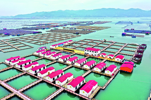 7月1日拍摄的霞浦县溪南镇七星海域深水网箱养殖区内的渔排民宿(无人机照片)。近年来,福建省霞浦县在开展海上养殖综合整治、促进海洋经济转型升级和海洋环境持续优化的基础上,抓住海洋养殖、全域旅游两个富民产业,探索渔旅融合发展新模式。新华社记者姜克红摄