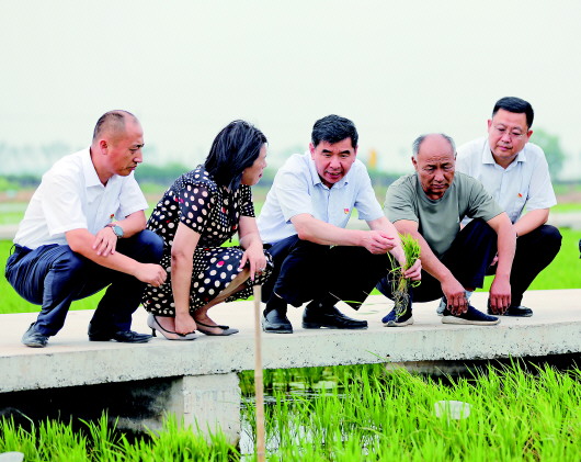 7月2日,在东营市垦利区一邦农业公司耐盐碱水稻实验基地,垦利区委书记刘斯杰(中)和企业负责人察看水稻长势。