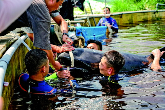 “部分瓜头鲸由于搁浅时间过久,还不能完全保持身体平衡,需要我们托扶,否则容易呛水引发肺部感染。”常峰说。
