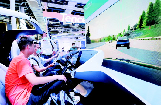 7月8日,参观者在世界人工智能大会的展览现场体验一款智能座舱的仿真自动驾驶功能。新华社记者方喆摄