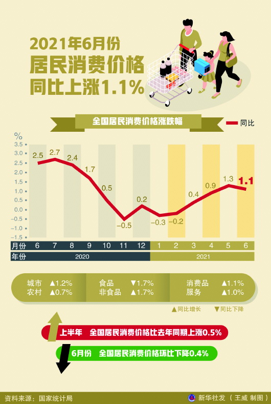 新华社北京7月9日电(记者魏玉坤、邹多为、陈爱平)国家统计局9日发布数据,6月份,全国居民消费价格指数(CPI)同比上涨1.1%,全国工业生产者出厂价格指数(PPI)同比上涨8.8%,涨幅均比上月回落0.2个百分点。