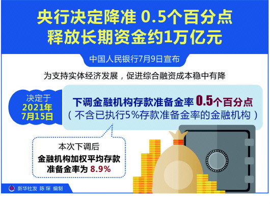 新华社北京7月9日电(记者吴雨)中国人民银行9日宣布,为支持实体经济发展,促进综合融资成本稳中有降,决定于2021年7月15日下调金融机构存款准备金率0.5个百分点(不含已执行5%存款准备金率的金融机构)。本次下调后,金融机构加权平均存款准备金率为8.9%。