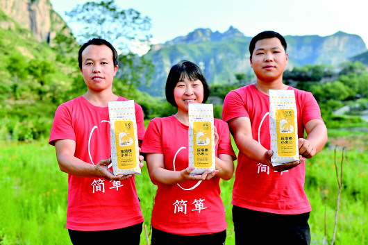 在山西省平顺县榔树园村,魏美玲(中)和合作社同事一起展示包装好的小米(7月8日摄)。