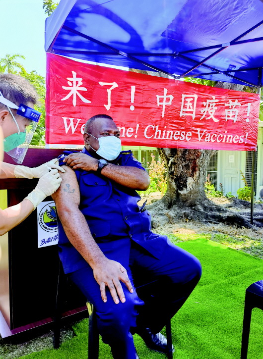7月13日,在巴布亚新几内亚首都莫尔兹比港,一名男子接种中国疫苗。新华社发(中国驻巴新大使馆供图) |