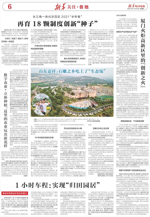 新华社杭州7月14日电(记者俞菀、崔力)“准备出发,全程63公里,大约需要54分钟……”在导航中输入上海市中心到嘉善横港村的坐标,会跳出这样一段语音。对于许多长三角“都市客”而言,嘉善县姚庄镇横港村是一个开车1小时就能实现“归田园居”的地方。