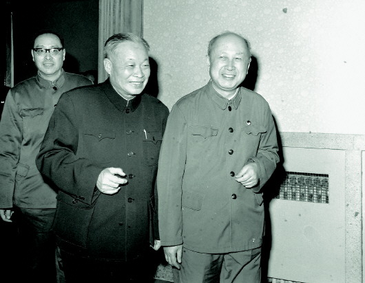 钱三强(中)和钱学森(右)在1978年全国科学大会上。新华社资料片 |