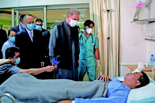 7月18日,巴基斯坦外长库雷希(中)在位于巴首都伊斯兰堡附近的陆军总医院看望慰问在日前达苏恐怖袭击事件中受伤的中方人员。 新华社发(艾哈迈德·卡迈勒摄)