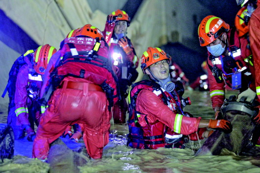 抽排隧道积水是第一要务。从15日开始,大功率排水泵车一辆一辆从四面八方赶来。从18日开始,救援现场采取了“龙吸水”排涝车串联接力方式,调动31支队伍、10套14台设备,一套设备一个专班接替作业,保障抽排工作持续推进。截至19日上午9点,隧道内水位下降了15.5米。