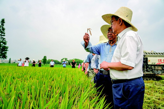 7月19日,专家们在查看“中科发早粳1号”的稻穗。 新华社记者周密摄