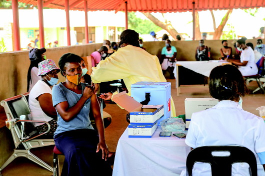 这是3月24日,一名女子在津巴布韦维多利亚瀑布城一家医院接种中国国药集团新冠疫苗。 新华社发(陈雅琴摄)