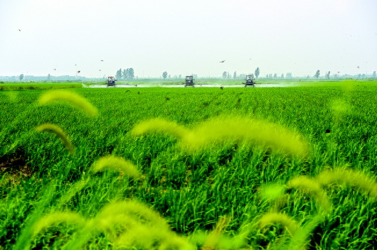 7月20日,颍上县王岗镇农民驾驶农机在稻田里作业。近日,安徽省颍上县农民抢抓农时,为丰收打好基础。 新华社记者黄博涵摄