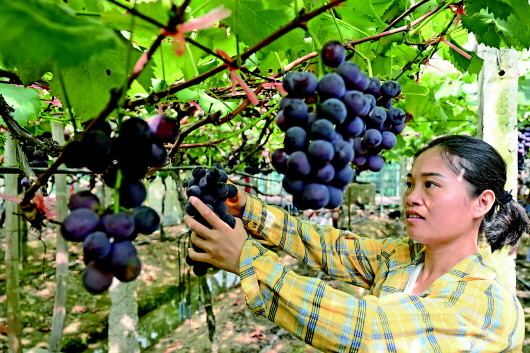 7月20日,福安市赛岐镇象环村村民刘雅容在采摘葡萄。