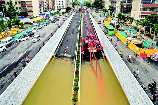7月21日在郑州市桐柏路附近拍摄的排涝现场(无人机照片)。7月20日,受强降雨影响,郑州桐柏路下穿陇海路隧道严重积水,江苏消防救援总队徐州支队奉命连夜赶到并迅速抽水排涝。新华社发(麻翛然摄) |