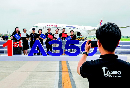 7月21日,空客工作人员在空客A350飞机前留影。当日,在空客天津宽体机完成和交付中心A350项目投产暨首架飞机交付仪式上,空中客车宣布,空客天津宽体机完成和交付中心A350项目正式运营,其首架A350飞机正式交付中国东方航空集团有限公司。这也是首架在中国完成交付工作的空客A350飞机。 新华社记者张玉薇摄
