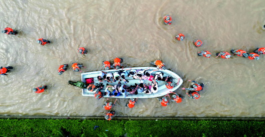 7月22日,在郑州市中牟县阜外华中心血管病医院附近的锦绣路与郑开大道交叉口,救援人员利用舟艇转移人员。由于连日降雨形成的严重积水无法及时排除,7月22日上午,郑州市中牟县阜外华中心血管病医院开始转移病患、病患家属和医护人员。 新华社记者才扬摄 |