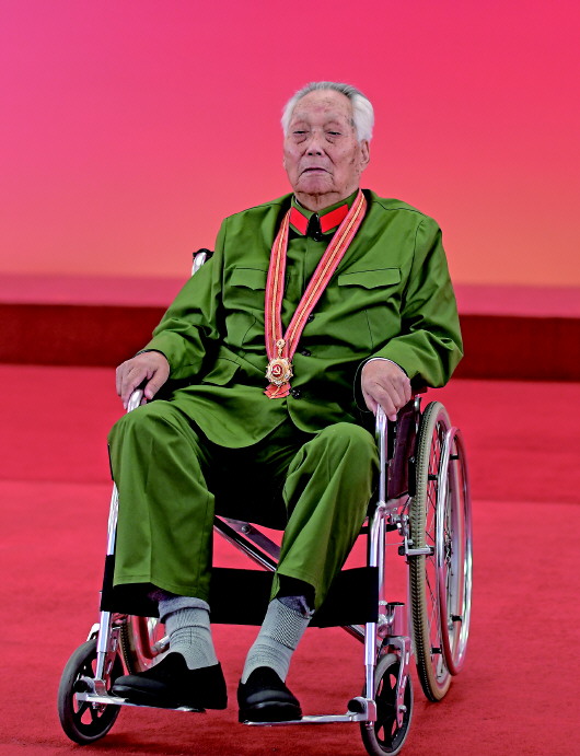 2021年6月29日,101岁的郭瑞祥身着绿军装,坐在轮椅上接受了习近平总书记亲自授予的“七一勋章”。