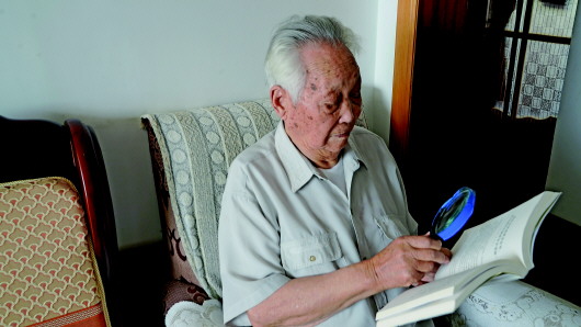 随着年龄的增长,原先只戴老花镜看书的郭瑞祥,现在还得右手拿着放大镜。