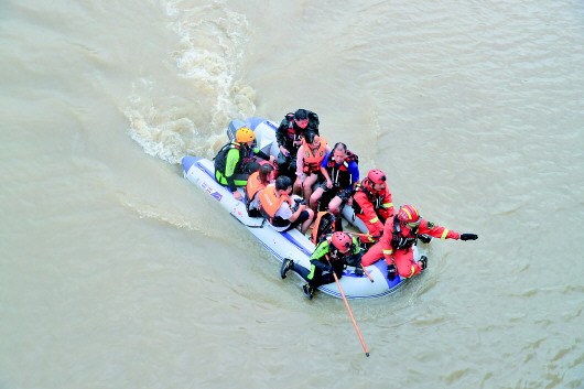 7月25日,救援人员在宁波市海曙区洞桥镇一带转移被困群众。