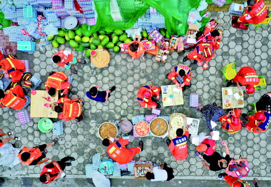 22日晚,余涛和队员们在郑州市中牟县参与救援,两天没有吃到一口热饭。“当时水、电、通信全部中断,很多店都不开门,一个酒店老板突然过来拉着去吃面,说必须去吃,吃饱了才有力气接着干。”余涛说。