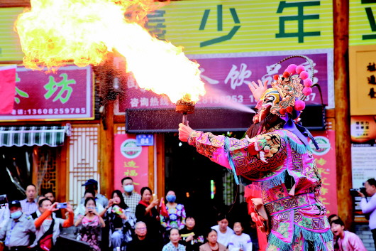 内江市东兴区东兴老街,川剧演员为观众表演“变脸吐火”(2020年10月1日摄)。 新华社发 |