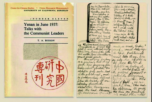 1937年,托马斯·亚瑟·毕森和朋友们到访延安,左起为菲立浦·贾菲、佩吉·斯诺(尼姆·威尔斯)、欧文·拉铁摩尔、毛泽东、毕森、艾格尼丝·贾菲。 |