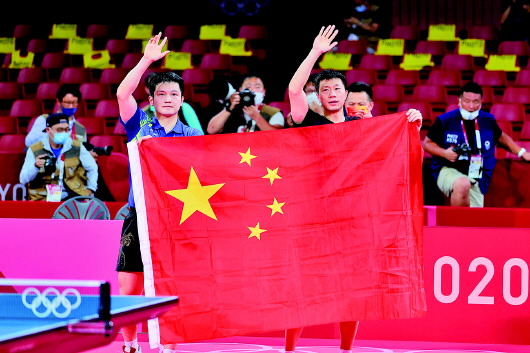 7月30日,马龙(前右)和樊振东在比赛后共展国旗。 新华社记者王东震摄 |
