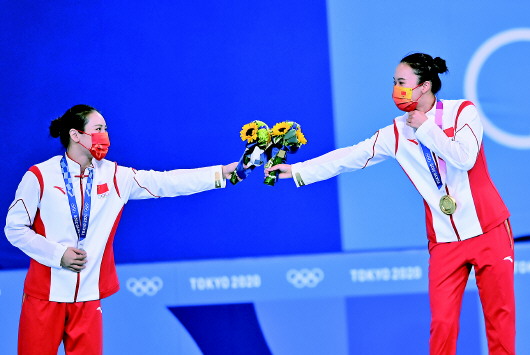 30日的奥运赛场上还三次同时飘扬起两面五星红旗。除了前一日已提前将金、银牌收入囊中的羽毛球混双和乒乓球男单,当日开赛的蹦床女子个人赛,中国也包揽冠亚军。刘灵玲和朱雪莹从资格赛到决赛都表现完美,始终占据前两位,最终朱雪莹以56.635分获得冠军。羽毛球混双决赛,王懿律/黄东萍2:1战胜队友郑思维/黄雅琼夺冠,乒乓球男单决赛,马龙4:2击败樊振东夺金,成为乒乓球男单奥运卫冕第一人。