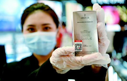 7月31日,海口日月广场免税店的工作人员展示加贴溯源码的香化商品。