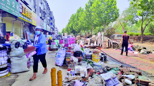 八月三日,卫辉市区内洪水逐渐退去,人们积极组织自救,重建家园。新华社发(翟京元摄)