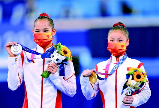8月3日,管晨辰(右)与唐茜靖在颁奖仪式上。 新华社记者兰红光摄