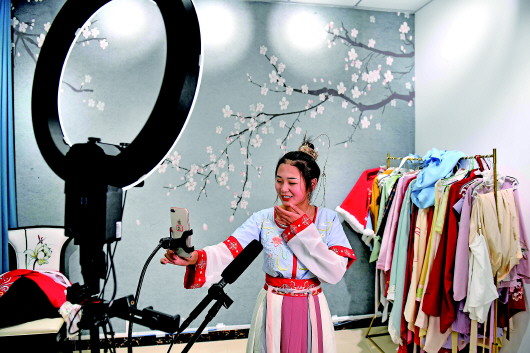 2020年12月11日,在山东省曹县职业教育中等专业学校实训基地,一位学生在直播销售汉服。 新华社记者郭绪雷摄