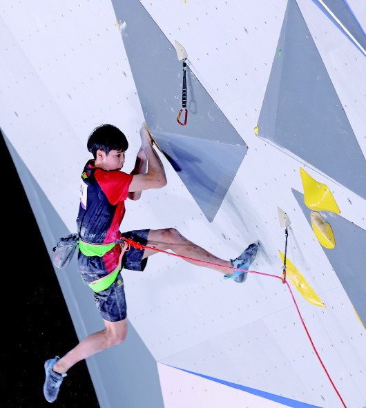 8月3日,潘愚非在攀岩男子难度预赛中。 新华社记者陈建力摄