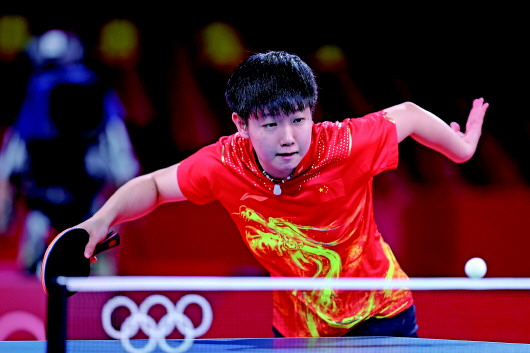 8月5日,中国队选手孙颖莎在比赛中。当日,在东京奥运会乒乓球女子团体决赛中,中国队对阵日本队。 新华社记者杨磊摄
