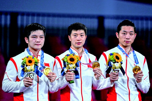 ![]() 8月6日,中国队选手马龙(中)、许昕(右)、樊振东在颁奖仪式上。当日,在东京奥运会乒乓球男子团体决赛中,中国队以3比0的总比分战胜德国队,实现中国在该项目上的四连冠。