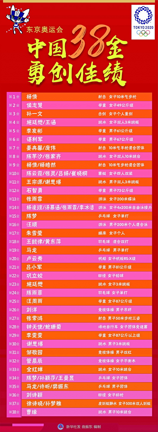 此外,巩立姣、吕小军、马龙、庞伟、施廷懋、王涵等老将发挥出色,杨倩、张常鸿、全红婵、陈芋汐等多名“00后”开始挑起大梁。
