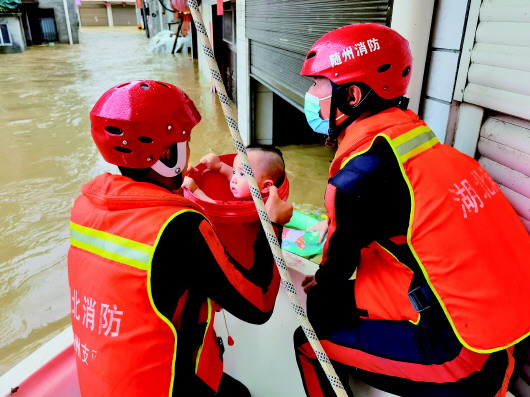 8月12日,在湖北省随州市何店镇,救援人员转移被困人员。 新华社发 |