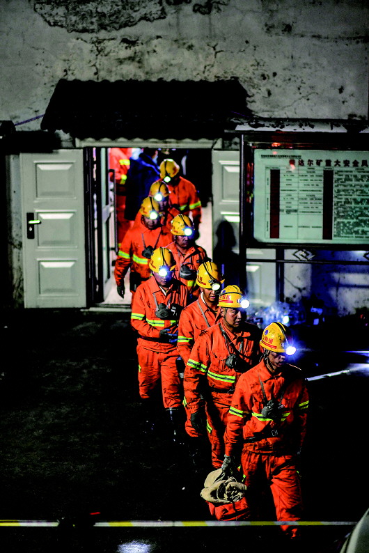 8月15日,消防队员从矿井入口处走出。