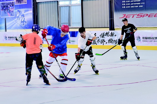在文轩体育文化中心的轮滑冰球馆内,爱好者们在进行旱冰球比赛(6月11日摄)。