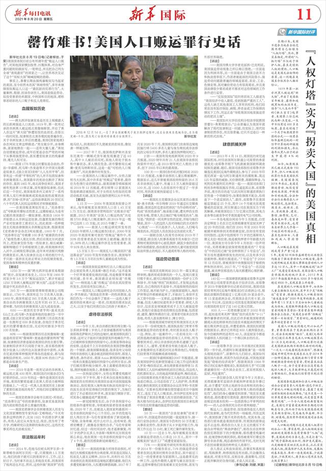 贩运人口、强迫劳动、奴役虐待是反人类的现代奴隶制,是当代世界的一场瘟疫。而在这其中,美国扮演了极不光彩的角色。究其本身,这些恶行原本就是美国的原罪。而美国的原罪远远不止这些。那些在白人至上主义的重压下不能自由呼吸的“弗洛伊德们”,那些生活在种族仇恨犯罪阴影下的少数族裔,那些遭受残暴对待、处境悲惨的难民移民,那些被美军打着反恐旗号非法杀戮、残忍虐待的外国平民,无时无刻不在控诉着美国的种种反人类罪行。