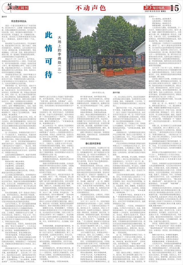 李商隐也是一个背负巨石上山的西西弗斯。推而广之,每个人都是命运的西西弗斯。在川东折而北返的李商隐肯定不曾预料到,几年之后,他将有第二次四川之行,并将在盆地深处的一座小城,度过相对平静的几年——很有意思的是,他一辈子的学习对象和河南老乡杜甫,也曾在这座小城度过了相对平静的几年。这对流寓的李商隐来说,是一种安慰和鼓励:既然先贤已经有过和我相似的生活,那这样的生活将因先贤而有了意想不到的重量。