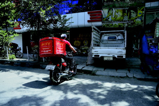 8月21日,外卖员在阿富汗喀布尔街头工作。