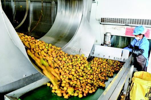 8月19日,在贵州省龙里县高新技术产业园区一家刺梨加工企业,工人在传送带上筛选刺梨鲜果。近年来,龙里县持续推进农业产业结构调整,以“退耕还林”项目实施为契机,鼓励有条件的乡镇种植刺梨。目前,龙里县刺梨种植面积从2000年的近6000亩扩展到如今的10.5万亩,年产刺梨鲜果1.6万吨,带动8000余户农户实现增收。同时,通过引进刺梨精深加工企业,加大刺梨浓缩汁、刺梨饮料、刺梨果脯等系列产品的研发力度,年综合产值达4亿元以上,刺梨产业已成为当地农民增收致富的支柱产业。