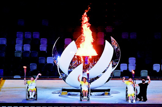 8月24日,第16届夏季残疾人奥林匹克运动会开幕式在日本东京举行。这是开幕式上主火炬被点燃。