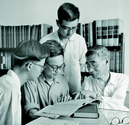 郭永怀(右一)在解答研究生提出的问题(资料照片)。 新华社发