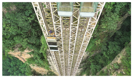 8月27日,湖南张家界武陵源景区工作人员在百龙天梯的悬崖钢井架上巡检(无人机照片)。新华社发(吴勇兵摄)