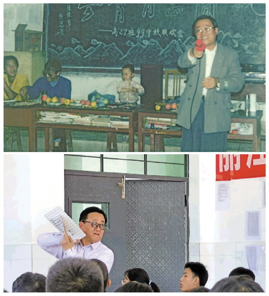 拼版照片:上图为海安老师王霖伯在宁海民族中学高27班教室过中秋节(资料照片,1999年9月摄);