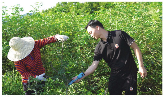 曾兆敏(右)和村民一起修剪花椒枝。 受访者供图