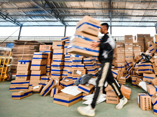 8月26日,河北省玉田县鸦鸿桥镇一座电商物流仓库的工作人员在搬运待发货的产品。河北省唐山市玉田县鸦鸿桥镇享有“京东第一大集”美誉,拥有小商品城、针织、建材等12个专业市场,临街门店和市场摊位1.3万个。近年来,鸦鸿桥镇依托产业优势,着力打造电商产业园,为企业搭建直播平台,营造常态化的直播商业氛围,以线上营销新渠道推动当地经济发展。 新华社记者牟宇摄