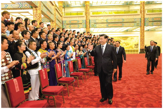 8月31日晚,第六届全国少数民族文艺会演开幕式文艺晚会在北京人民大会堂隆重举行。习近平、李克强、汪洋、王沪宁等党和国家领导人出席观看。这是演出开始前,习近平等会见文艺会演演职人员代表、组委会成员、56个民族的优秀基层党员代表等。