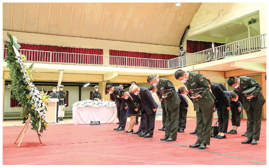 9月1日,在韩国仁川,中方代表团成员在志愿军烈士遗骸装殓仪式现场鞠躬致敬。